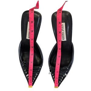 Steve Madden Women's 6/6.5 Brianne Black Pointed Toe Mule Pumps Heels. Pointed-toe heels with decorative lace-up detailing. Mule pumps in black. Y2K vibes. Simple slide on with rubber outsole for nonskid grip. Lightly cushioned insole. Flirty stiletto heel. *See size description and measurement of shoes in listing photo.*