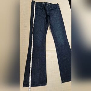 Chic dark blue flare jeans. Stylish and comfortable. Perfect for any look. has an issue in the video, but other than that, it's still in excellent Condition.