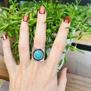 Elevate your style with this stunning turquoise and hammered silver adjustable statement ring. Perfect for any occasion.