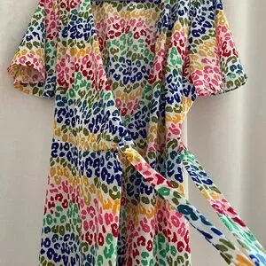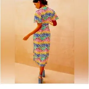 Bright and bold midi wrap dress. Features a lively mix of colors. Perfect for adding flair to your style.