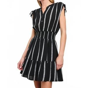 Elevate your summer wardrobe with the Women's Samina Dress by Rails, a stunning piece in Ash Leno Stripe. Embrace boho chic style with its cap sleeves and flattering fit-and-flare silhouette. Crafted from a luxurious linen blend (55% Linen, 45% Rayon), this dress features a V-neck and button closure for added elegance. Imported and perfect for vacations, maintain its look with a simple hand wash.