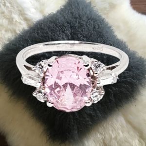 .Pink Sapphire Sterling Silver Ring with 3 CZ Stones on Each Side