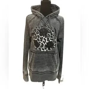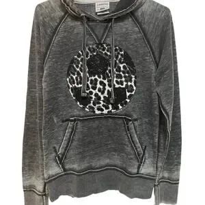 Stylish gray sweater with a bold graphic design. Features a comfortable hood and front pocket.
