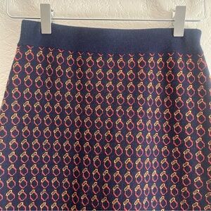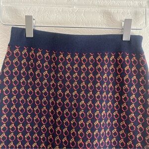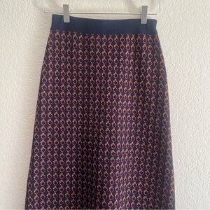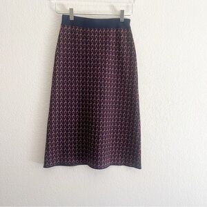Skirt by J Crew. Style is the Geo Ring Skirt. Merino Wool Blend. Dark blue with Red circle print. Midi length