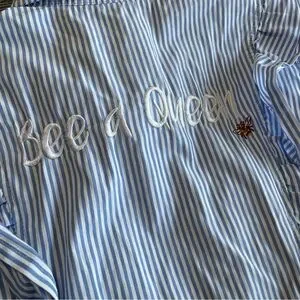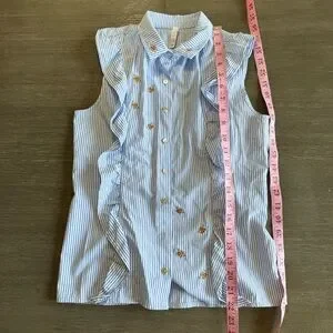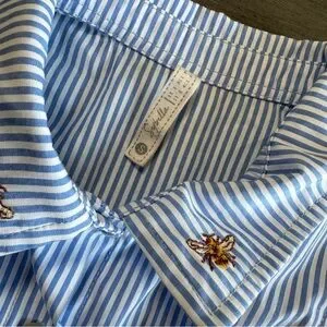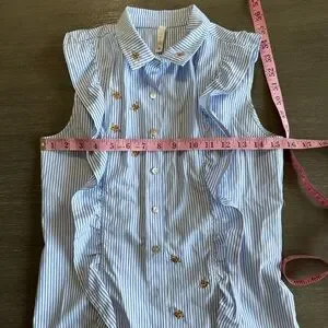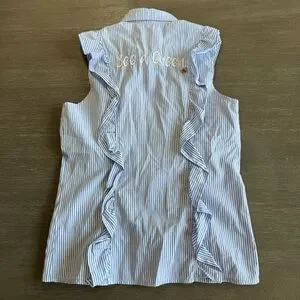 Bee Embroidered Sleeveless Button Down Blouse Ruffle Blue White Sybilla S