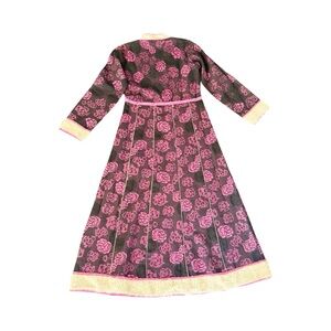 A soft rebellion wrapped in florals—this vintage long sleeve dress evokes twilight strolls and whispered secrets. The pink and black palette is punctuated by delicate beige trim along the neckline, cuffs, and hem, with vertical lines that elongate and flatter. A deep V-neckline adds a touch of allure, while the long sleeves offer hippie elegance and edge.