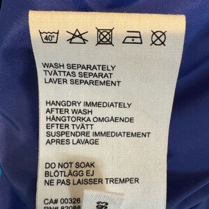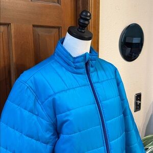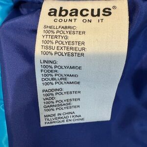 Chic blue puffer jacket by Abacus. Ideal for cold weather. Lined, zipper in front. Two pockets.