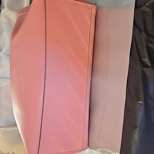 This elegant pink tote bag is perfect for any occasion. Its stylish design and spacious interior make it a must-have accessory. 12.5" bottom, 11" top, 11" tall
