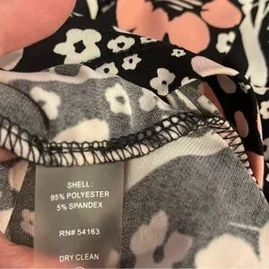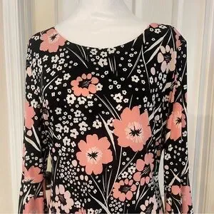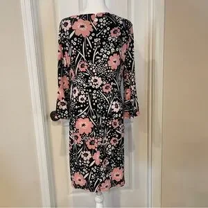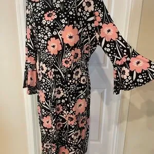 Elegant Tommy Hilfiger floral dress with bell sleeves. Size 14. Condition is like new. This dress is gorgeous and so comfortable. The floral pattern of white and pink stand out against the black background. Bell sleeves are 3/4 length, dress is knee length. Silver tone logo zipper pull. A line dress. I'm a bit curvier than the mannequin.