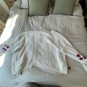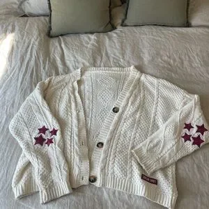Taylor Swift RED album cardigan. It has been well loved by me, but it’s time for a new home. One of the buttons has just come undone and there is a slight hole in one shoulder (included pics), which is a quick fix at home or at the cleaners/tailor. The cuffs have some slight discoloration, but on the whole it is in great condition and so snuggly. Oversized fit. XL/2XL