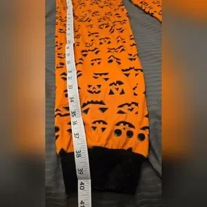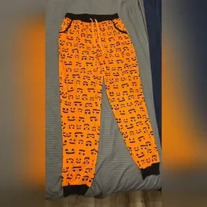 Bright orange jogger pants with black pumpkin print. Wear them inside as pajama pants or outside with cute booties. Jack O lantern. Perfect for Halloween.