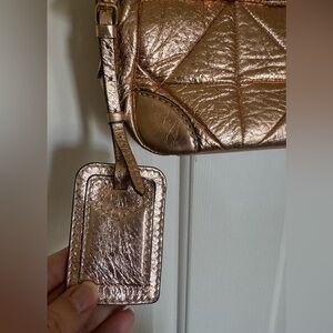 Excellent condition. Immaculate bag. Super clean and well cared for. Color is a metallic rose gold/copper. Strap is gold hardware chain with metallic leather for a comfortable fit on your shoulder. Detachable “luggage tag” bag ornament. Fabric lined interior in a light tan shade. One wall zip compartment. Exterior bag zipper has leather pull tab.