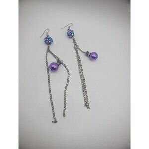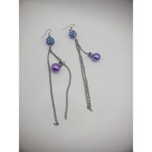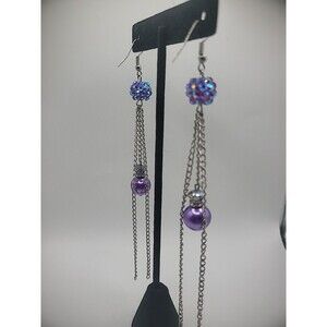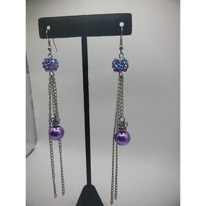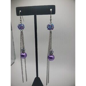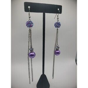 Vintage Earrings Pierced Hook Drop Dangle Beaded Purple Silver Tone Chains