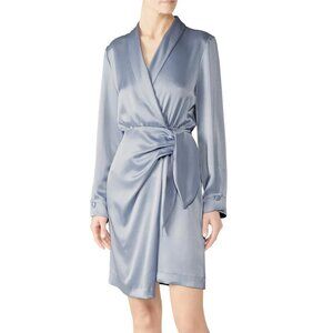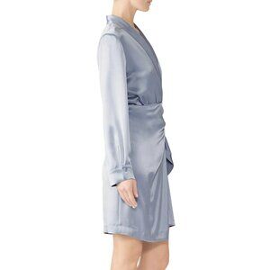 Blue satin (78% Triacetate, 22% Polyester). Wrap dress. Long sleeves. V-neckline. Hidden button and snap closure. 38" from shoulder to hemline. Imported.