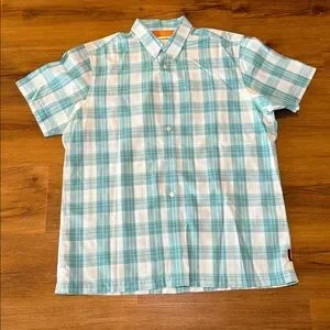 Casual button-down with a teal plaid pattern. Features short sleeves, and a button down collar.