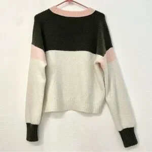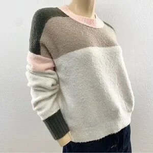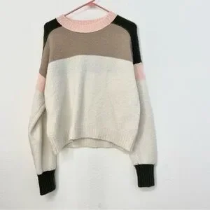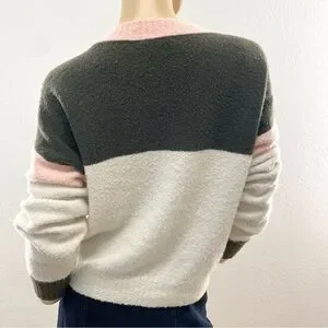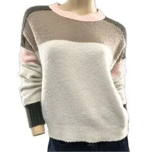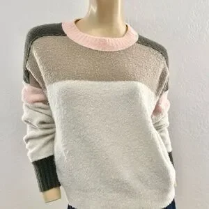 Soft and stylish crew neck sweater. Features a blend of cream, pink, brown, and green. Perfect for layering. Soft boucle type fabric.