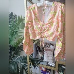 Brand new and never worn. V neck, long sleeve fruity floral top in peach and green. Cropped length. Light and airy. Smocked waist at back hem, making top fitted around the waist. Flowy balloon sleeves. Perfect for spring and summer. Can be worn as a cute casual blouse or dressed up. Boho style top is ruched in the waist and can be adjusted up and down to fit your preferred length. Top loops around the neck for a trendy blogger chic look. Rayon and Nylon blend.