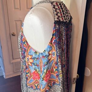 Delicate, boho, pattern, mixed print, tie front or back, high neck, summer, lightweight, colorful