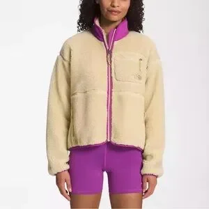 Soft teddy jacket with cream body and purple trim. Perfect for warmth and style. Only worn once