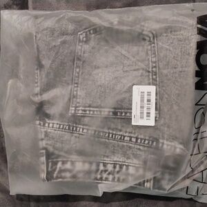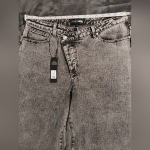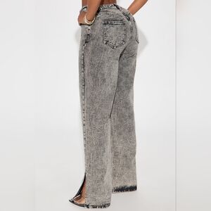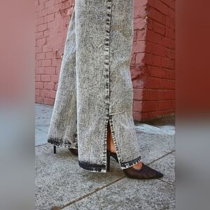 Elevate your style with these chic slit straight leg grey acid wash jeans. Non stretch.