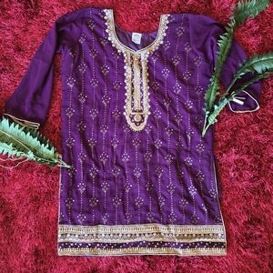 Purple and gold embroidered kurta. See-through sleeves, some false buttons are missing as shown.