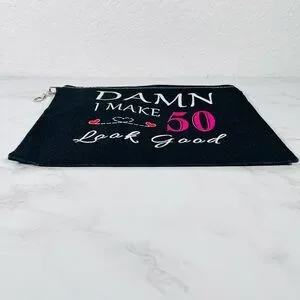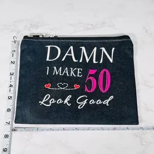 Stylish blue denim canvas pouch with fun text design. Features white and pink lettering.