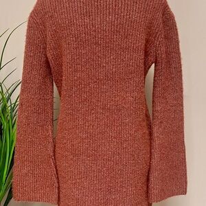 The ABBIE sweater dress is expertly crafted with a turtleneck and flare sleeves and offers a relaxed yet stylish fit. The soft brushed material provides warmth and comfort, making it the perfect mini dress for cooler weather. Elevate your wardrobe with this versatile and chic pullover dress. The color of the dress pictured is baked apple.