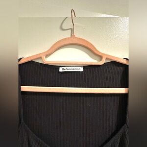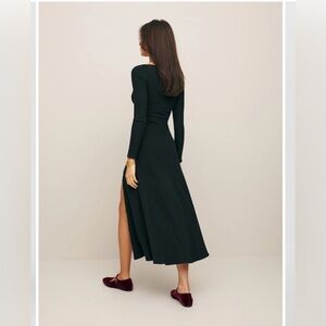 Not complicated. The Banks Dress from Reformation, a long sleeve, black knit midi length dress with a sweetheart neckline and a side slit. Classic, comfortable, great for fall/winter. Very good condition. Size M, flattering and true to size. Slight stretch.
