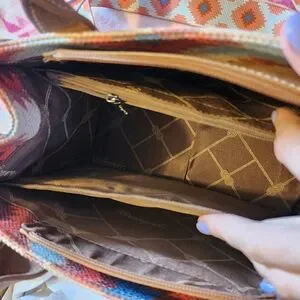 Stylish Wrangler tote with Aztec pattern. Features brown and blue tones. Perfect for everyday use.