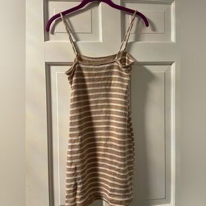 Chic dress with tan and white stripes. Features thin straps and relaxed fit.