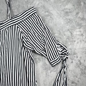 Miss Lili 2X Striped Off Shoulder Button Front Blouse Black White Tie Sleeve