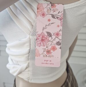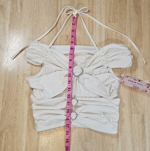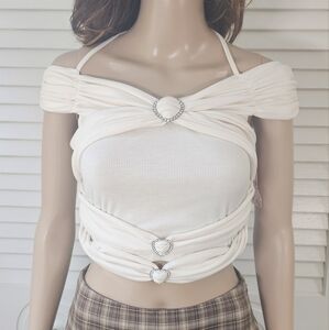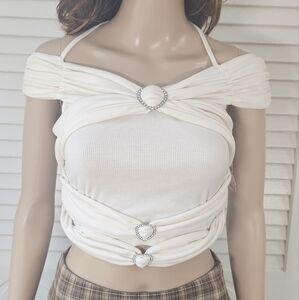 NWT✨️ Super cute unique cream colored crop top featuring rhinestones, off shoulder sleeves & a tie string around the neck. Women's size small or US size 4, has some stretch.