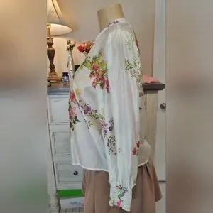 Chic floral button-up blouse with vibrant colors. Perfect for any occasion.