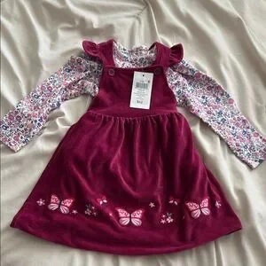 Charming burgundy dress with butterfly embroidery. Includes a colorful floral long-sleeve top. Perfect for casual outings.