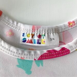 Adorable dress with a lively floral design. Features pink and teal accents. Ideal for casual outings.