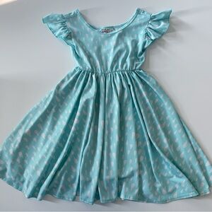 Adorable teal dress with flutter sleeves. Features a fun raindrop pattern. Perfect for casual outings.