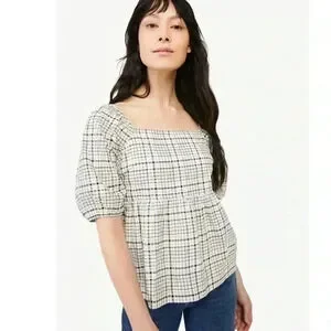 Free Assembly Size XS Cream Plaid Organic Cotton Women's Puff Sleeve Blouse Top