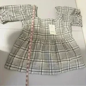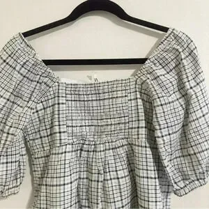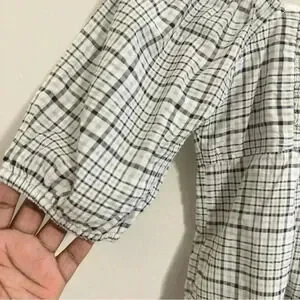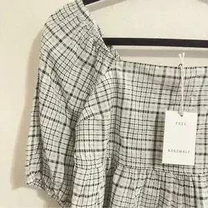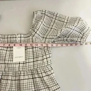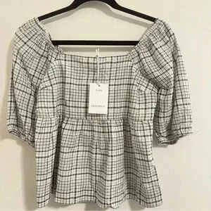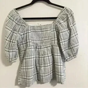 Free Assembly Size XS Ivory Plaid Organic Cotton Women's Puff Sleeve Blouse Top