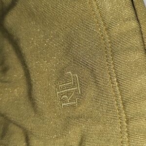 Metallic jersey surplice top from the Lauren Ralph Lauren line, which features figure-flattering ruching and a hint of shimmer, often enhanced with the brand's embroidered monogram
