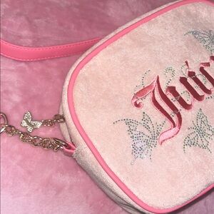 This Juicy Couture crossbody bag is a besutiful pastel pink with a darker pink trimming combining style and functionality, making it an ideal choice for daily adventures. Crafted with attention to detail, it features the iconic Juicy branding and rhinestone butterfly detailing, ensuring a fashionable statement wherever you go. Its compact design allows for easy carrying of essentials, perfect for those on-the-go moments.