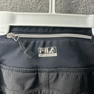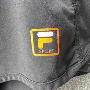 Black women's FILA shorts size XS with built in liner. The back has a small pocket. The FILA logo on the back of the shorts has some small wear as shown in the photo.