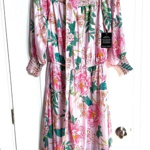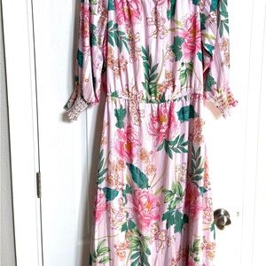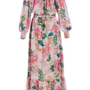 Chic off-shoulder top with floral design. Features pink, green, and white hues. Stunning floral blooms on a comfortable flowy maxi dress, designed with a sexy off-the-shoulder smocked neckline and a waist-cinching sash.