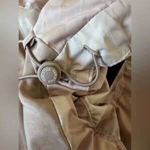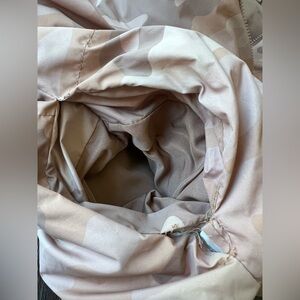 The Fabletics Women's Wander Camo Teddy Cropped Puffer Jacket in size XXL features a high collar and a zip closure, making it perfect for travel and casual occasions during the winter, fall, and spring seasons. The jacket has easy access pockets. It has a reflective zipper to complement the jacket. Deep inside left pocket. It also has adjustable waist adjustments. This jackets has little worn show in the inside of puffer and also has shown worn on the pockets of jacket. In the last two pictures you will see on each side of the pockets it has a small hole that seemed to be pulled when worn but can be easily fixed with sewing. If interested please check pictures before purchasing #B6
