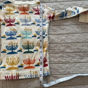 Small stain on front of pants. Barely noticeable. See pic. This product is a set of Hanna Andersson Kids Pajamas in size 3T, featuring a festive Menorah pattern and a rainbow Hanukkah design. Made from 100% cotton jersey fabric, this 2-piece long john pajama set has long sleeves and a pullover closure, making it both comfortable and easy to dress. The multicolor design and holiday theme make it ideal for the winter and fall seasons, adding a touch of joy to bedtime routines for young children. The brand Hanna Andersson is known for its high-quality and stylish baby and toddler clothing, making these pajamas a delightful choice for any young child.