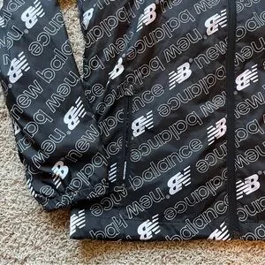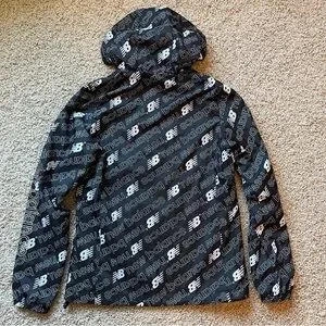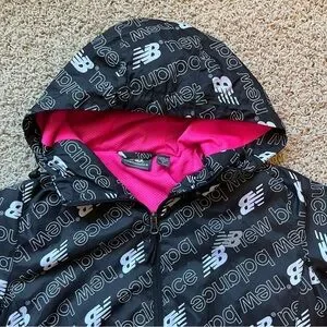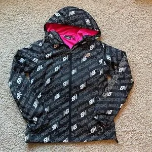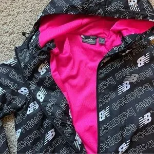 New Balance windbreaker jacket. Black with white logos all over with hot pink mesh interior. Adjustable hood. Full zip up front with pockets. 100% polyester