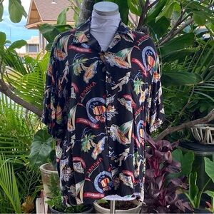 Joe Kealoha’s by Reyn Spooner vintage aloha shirt. Cool mistake, tag was sewn on upside down. Note vintage conditions has noticeable lint on black shirt.approximately:p2p 26”length 28”