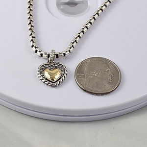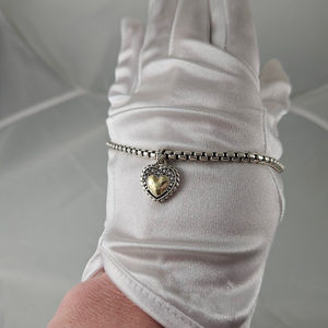 Thanks for looking! Lovely JAi by John Hardy 925 Sterling silver box chain bracelt with embellished / textured lobster clasp closure. Come with a beautiful Strerling silver and 14K gold heart charm symbolizing love. A classic piece that would be a great accessory for many occaisions: Bridal / Wedding, evening wear, prom, graduation, retirement, or fine dining. Vintage piece.