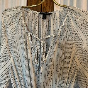 Banana Republic White Black Dot Sheer Chiffon Boho Midi Dress. An elegant and easy to wear dress. In a white with striped dots and subtle silver threads print. V-neckline with tie. Matching self tie belt with side loops. Loose sleeves with soft elastic cuffs. Ruffle tiered hemline. Sheer chiffon-like fabric. Great with an under slip or would make a great cover up as well. Great condition. Pet and smoke free home.