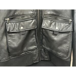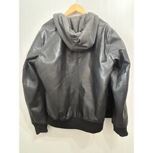 Levi’s black faux leather bomber jacket with a built-in gray hoodie insert (not detachable). Features a full zip front, ribbed cuffs and hem, quilted lining, and multiple zip and flap pockets. Sleek, warm, and made for cooler temps. Street-ready and rugged—perfect for back-to-school or fall layering. Tagged size Medium. Style code LM1RU919.