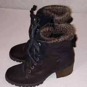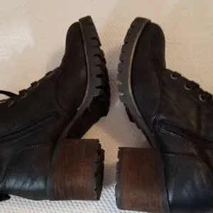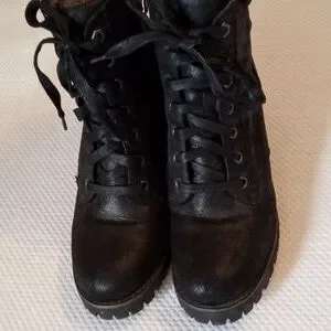 Black lace up w/ zip on side. Sweater border. 2" chunk heel e/ great traction
